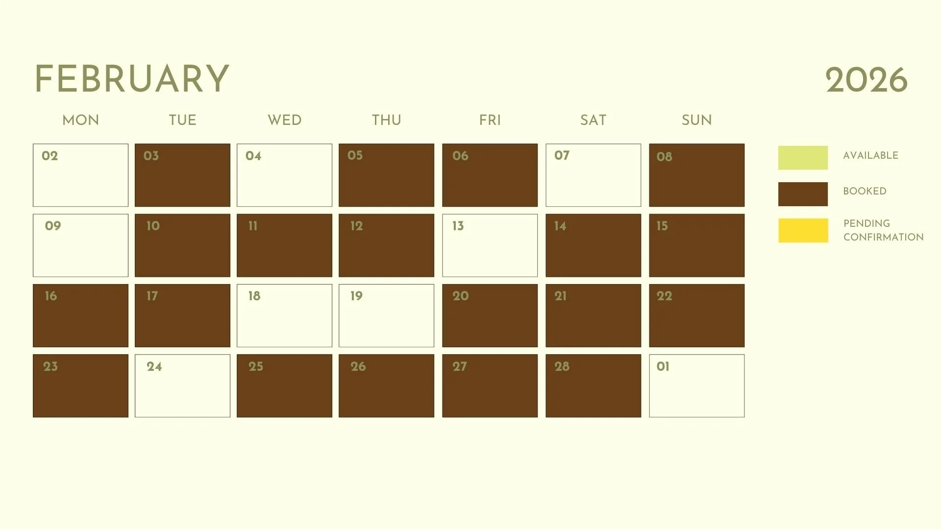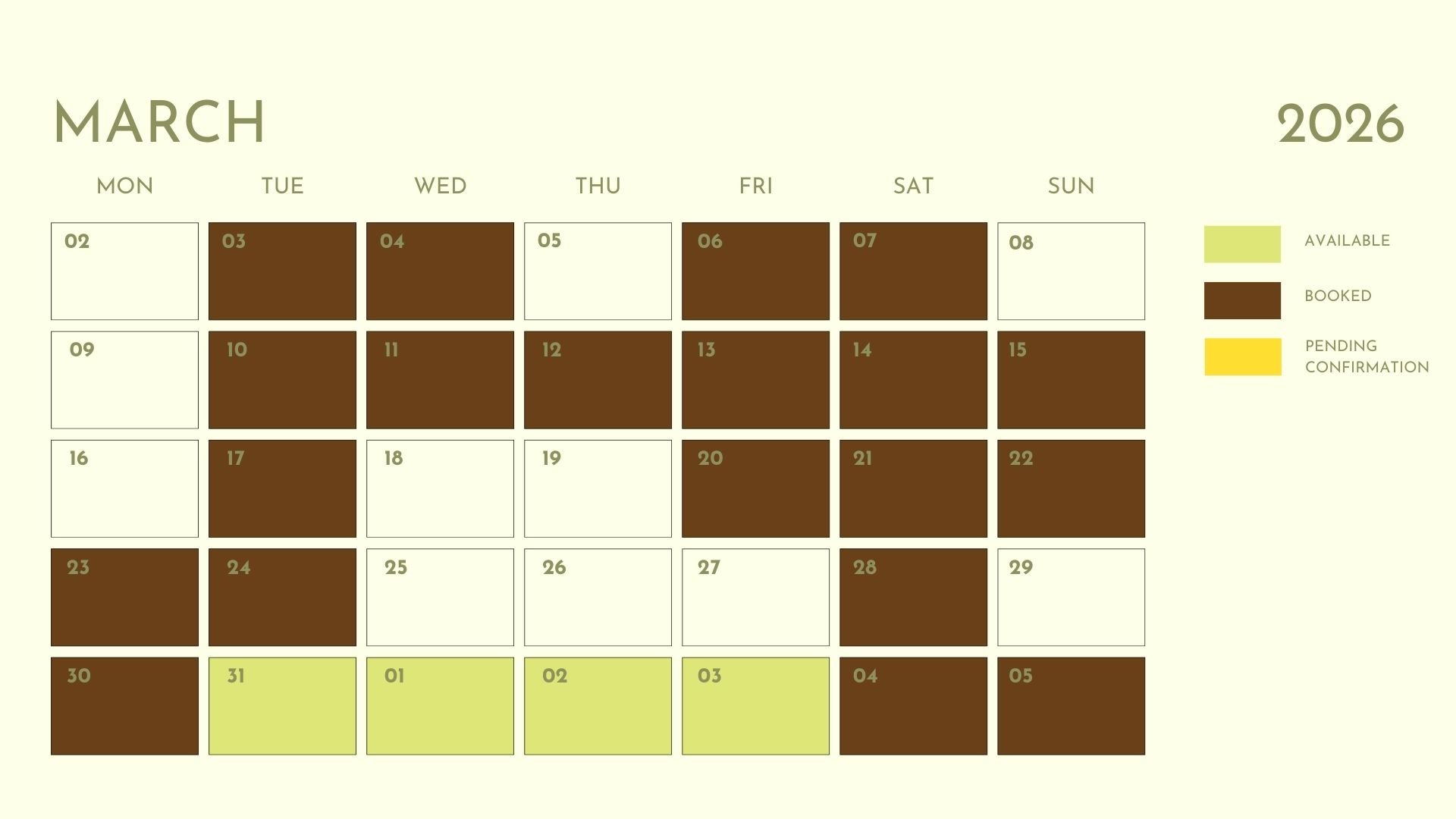 Below you can find my updated availability. I would recommend to always get in touch with me regardless of my availability as sometimes there are last-minute changes in my schedule!